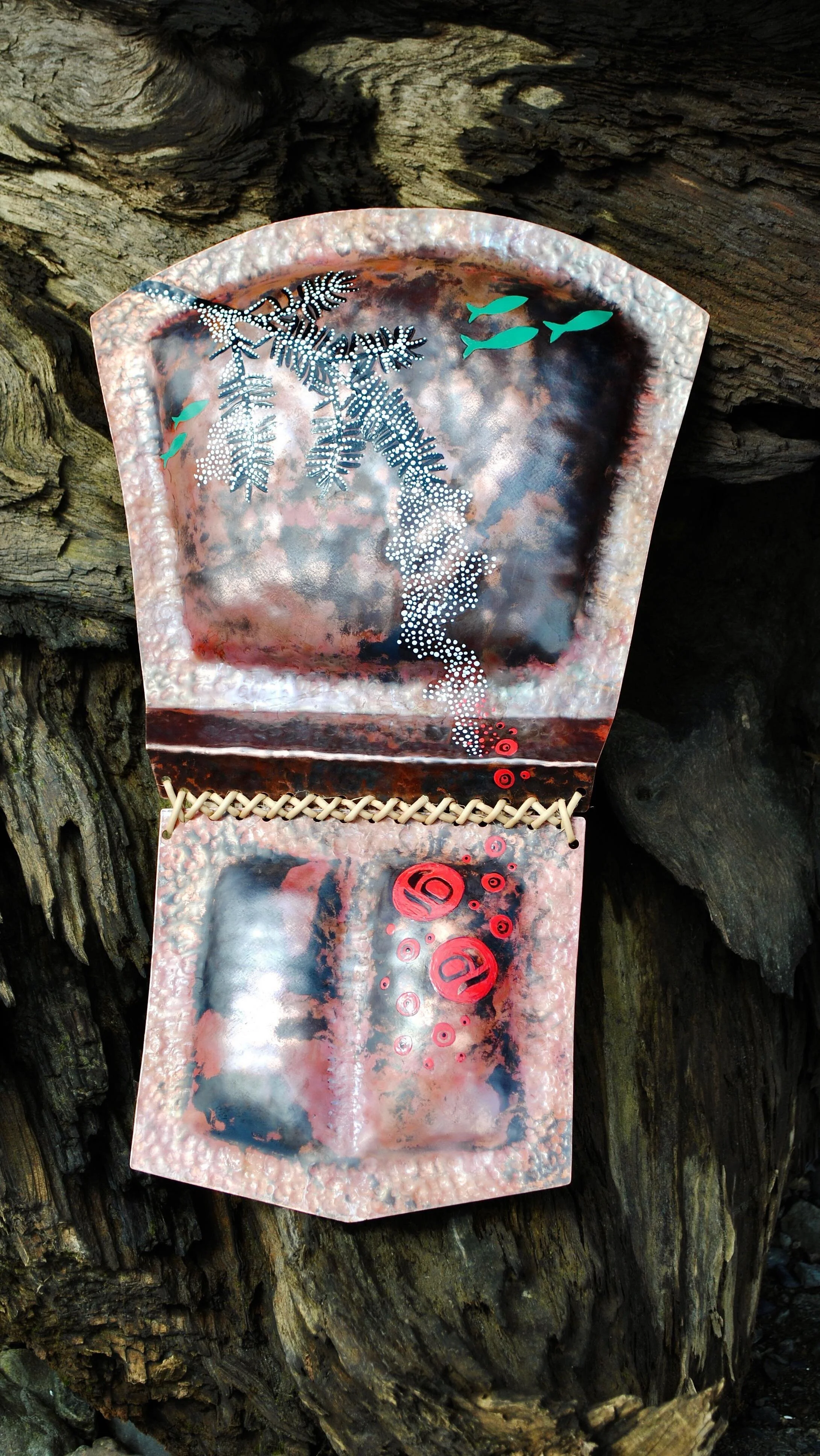 Jennifer works in silver, copper and gold. She incorporates her own original patinas and harvests Sitka Spruce roots to weave into her pieces.
